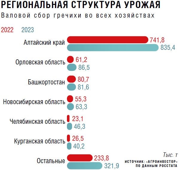 Урезать площадь гречихи будут и в Башкирии, которая, согласно данным Росстата, занимает третье место в стране по валовому сбору данной агрокультуры после Алтайского края и Орловской области (см. график). Если в прошлом году в республике под нее было отведено почти 87 тыс. га в 50 районах из 54 — на 20 % больше, чем в 2022-м, то в текущем посевы гречихи в регионе будут сокращены примерно на 3 % относительно 2023-го, сообщал «Башинформ».