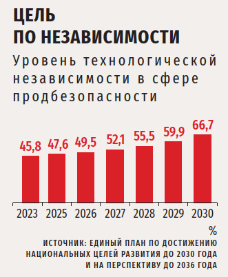 К 2030 году уровень технологической независимости России в сфере продовольственной безопасности должен составлять 66,7 %. По итогам 2023-го он оценивался в 45,8 %, план на 2025 год — 47,6 %. Показатель рассчитывается как среднее взвешенное значение уровней обеспеченности, готовности технологий и производства высокотехнологичного продукта (при наличии) по технологическим направлениям нацпроекта. Самый большой коэффициент веса для расчетов — 0,25 единиц — по показателю «уровень самообеспечения семенами отечественной селекции». Коэффициент 0,15 предусмотрен для показателя «достигнутый уровень технологической независимости по отечественным критически важным ферментным препаратам, пищевым и кормовым добавкам, технологическим вспомогательным средствам» (биотехнологии). Для всех остальных показателей действует коэффициент 0,1.