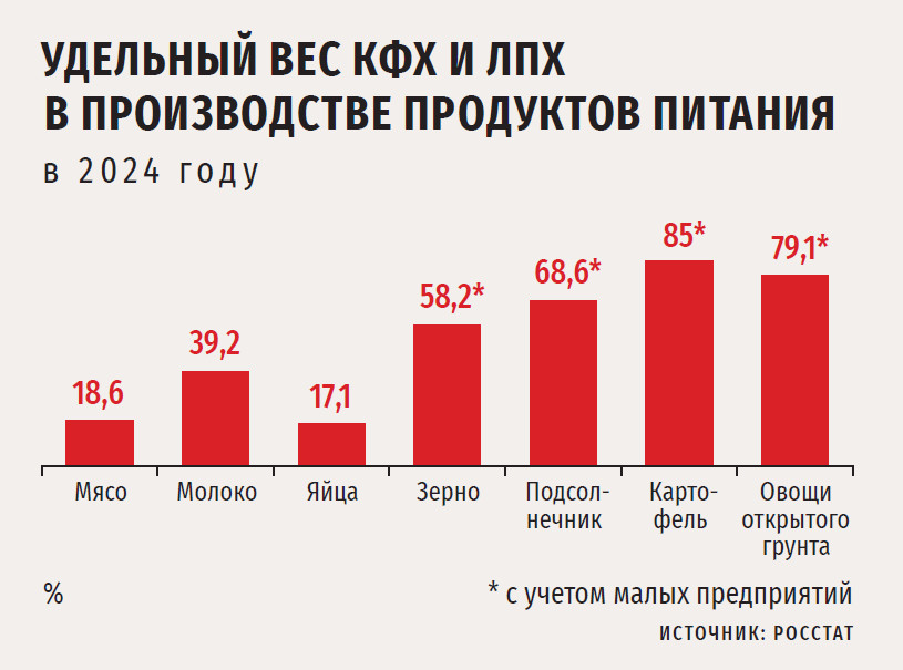 Министр сельского хозяйства Оксана Лут в ходе презентации федерального проекта «Развитие малого бизнеса» на Дне российского поля в Волгоградской области отмечала, что в поголовье крупного рогатого скота доля малых хозяйств составляет 55,9 %, овец и коз — 85,1 %. Фермеры и ЛПХ засевают 34,9 % всей площади агрокультур, а в овощах открытого грунта эта доля составляет 83,5 %. Всего в России более 160 тыс. крестьянских (фермерских) и более 17 млн личных подсобных хозяйств.