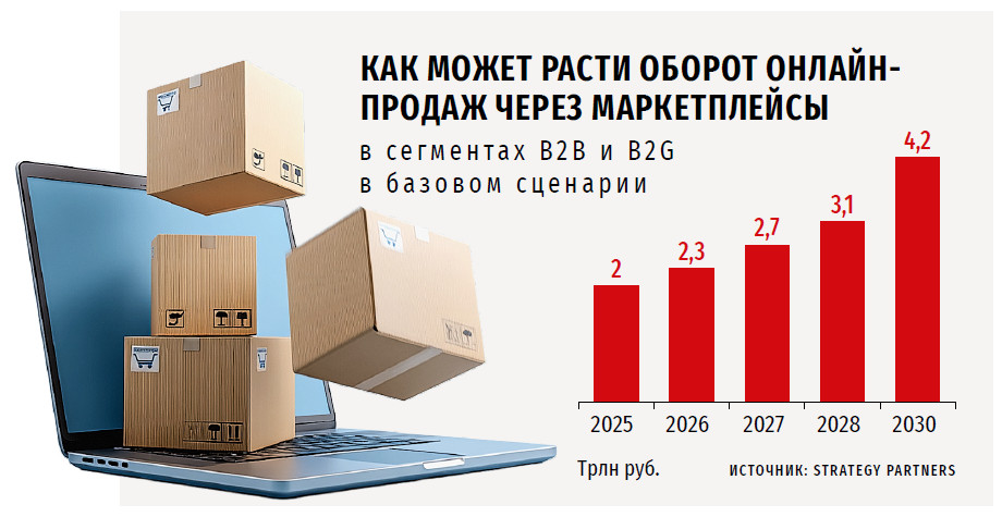Согласно оценке Strategy Partners, российский рынок B2B-маркетплейсов в 2019– 2024 годах показывал среднегодовой рост в 15 %. По итогам 2025-го оборот B2B (реализация бизнесу) и B2G (госструктурам) онлайн-продаж через маркетплейсы и интернет-магазины должен был составить порядка 2 трлн руб. (+11,1 % к предыдущему показателю), прогнозировала ранее консалтинговая компания. В перспективе темпы роста могут ускориться, и к 2030 году в базовом сценарии показатель может достичь 4,2 трлн руб., считают аналитики.