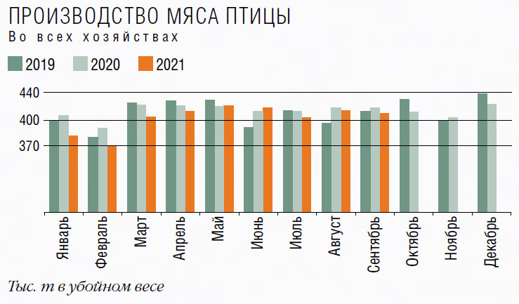 К концу года производство мяса птицы вряд ли выйдет на уровень прошлого в годовом выражении, скептичен президент Agrifood Strategies Альберт Давлеев. И скорее всего объемы сократятся на 1,5–2%: в промышленном секторе до 4,56 млн т, в целом — до 5 млн т в убойном весе. В прошлом году сельхозпредприятия выпустили 4,6 млн т мяса птицы, все категории хозяйств — почти 5,02 млн т. Однако, уточняет эксперт, в достоверности данных по производству мяса птицы в непромышленном секторе есть сомнения, на данный момент точных измерений и исследований на этот счет не проводится.