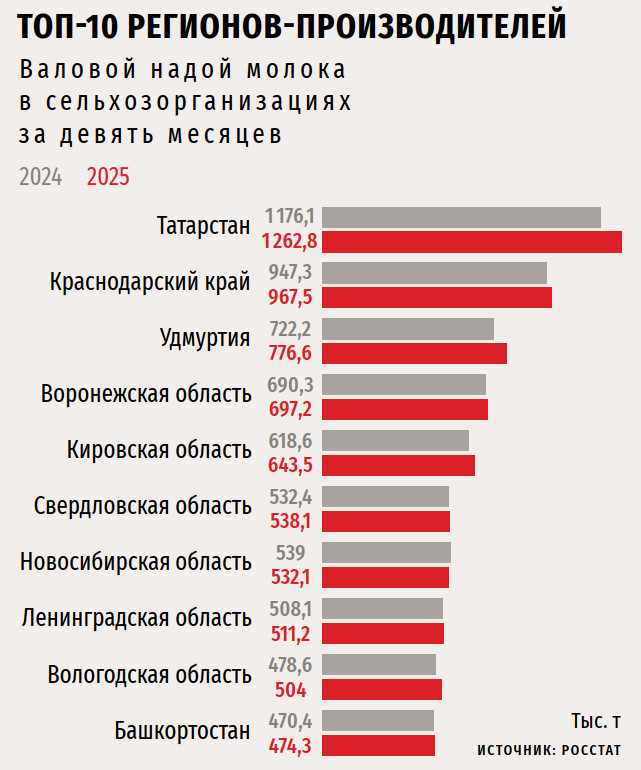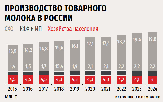 В 40 регионах, на которые приходится 35 % валового надоя молока, его выпуск сократился на 388 тыс. т, или на 4,1 % год к году. Наибольшее снижение наблюдалось в Ростовской области (на 88 тыс. т), Алтайском крае (29 тыс. т), Башкирии (23 тыс. т), Курской (23 тыс. т) и Саратовской (23 тыс. т) областях. В сельхозорганизациях валовое производство выросло на 3,4 % (или 521 тыс. т), однако почти весь этот прирост был направлен на замещение выпадающих объемов в других категориях хозяйств. По итогам 12 месяцев 2025-го в Союзмолоке ожидают увеличение общего объема товарного молока на 2 %. В 2024 году было получено около 26,3 млн т.