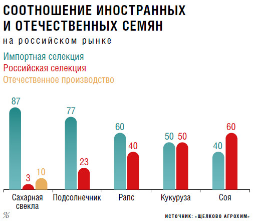 В стране уже зарегистрированы отечественные сорта и сахарной свеклы, и масличных, и картофеля. Но не все аграрии готовы их использовать, и на то есть вполне объяснимые причины, относящиеся не только к плохой маркетинговой составляющей. «Если мы будем использовать материал российских компаний, мы потеряем в урожайности, — опасается директор по растениеводству «Русской аграрной группы» (Рязанская область) Дмитрий Гарнов. — Пока что российский подсолнечник дает с гектара на 40 % меньше, по сое поздние сорта также более выигрышные у зарубежных партнеров, ввозная кукуруза более устойчива к заболеваниям и меньше реагирует на погодный фактор». Если озимая пшеница, по словам руководителя, практически во всей стране используется отечественной селекции, то яровая — импортной, хотя семена выращены в России. То же самое касается и ячменя. Соя в «Русской аграрной группе» на 50 % отечественной селекции, на 50 % — австрийской, рапс, кукуруза и подсолнечник — импортные, но производятся в России, хотя родительские формы и завезены из-за рубежа.