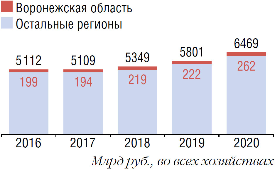 По данным департамента аграрной политики Воронежской области, сельское хозяйство, включая лесное, охоту, рыболовство и рыбоводство, по итогам 2019 года (данные статистики за 2020-й на момент подготовки статьи еще не были доступны) занимает третье место в структуре валового регионального продукта региона. За последнее десятилетие доля отрасли в ВРП области выросла с 7,5% до 12,3%. Согласно информации Росстата, в прошлом году производство продукции сельского хозяйства воронежскими аграриями в фактически действовавших ценах достигло 262 млрд руб., что составляет более 4% от общероссийского объема. «Агропромышленный комплекс Воронежской области находится в зрелой стадии — долгие годы занимает пятое место среди всех российских регионов по размеру ВРП сельского хозяйства», — отмечает старший менеджер группы по оказанию услуг предприятиям АПК компании EY Максим Никиточкин. При этом со среднегодовым темпом роста в 1,6% (CAGR за 2016–2019 годы) регион отстает как от многих регионов-лидеров, так и от среднероссийских показателей (CAGR за 2016–2019 годы — 4,6%), добавляет он.
