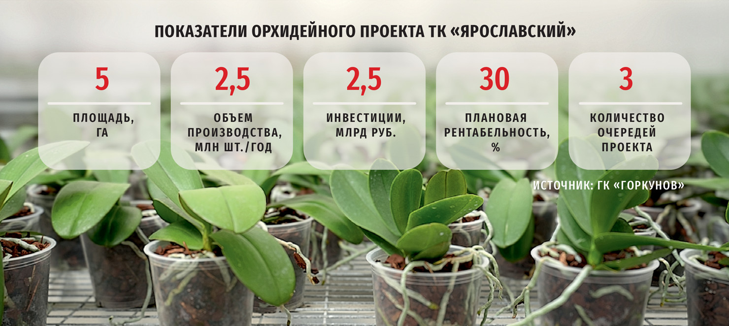 ГК «Горкунов» запустила промышленное производство орхидей полного цикла на базе тепличного комбината «Ярославский». На 5 га ежегодно будут выращиваться до 2,5 млн орхидей рода фаленопсис. По словам основателя и руководителя группы компаний Бориса Горкунова, такая мощность обеспечит импортозамещение до 50 % цветочной продукции данной категории на отечественном рынке к 2027 году. «Выращивание орхидеи — крайне сложный процесс: от синтеза клетки в лаборатории микроклонального размножения до зрелого цветка, готового к реализации, проходит около трех лет — это тяжелый и очень кропотливый труд», — сказал он на церемонии открытия производства. Это первый и единственный роботизированный комплекс по выращиванию орхидей в стране, подчеркнул тогда губернатор Ярославской области Михаил Евраев.