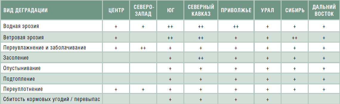 Регулярное обследование состояния почв страны проводится лишь с точки зрения их агрохимического состояния (содержания NPK, рН и гумуса), обновление же информации о почвенных свойствах и их деградированности на государственном уровне не ведется, оно было прекращено с развалом СССР, подтверждает Игорь Савин. Есть разрозненные обследования в отдельных регионах, которые не позволяют получить целой картины. Известно лишь, что процессы деградации протекают местами достаточно интенсивно, что, без сомнения, сказывается на плодородии почв и экономической эффективности их использования. «Интенсивное развитие таких деградационных процессов, как водная, ветровая и овражная эрозии, дегумификация, уплотнение, переувлажнение и заболачивание, вторичное засоление, осолонцевание, подкисление, загрязнение, опустынивание и прочие, не только приводит к заметному снижению плодородия почв, но и существенно ухудшает общую экологическую обстановку», — считает эксперт.