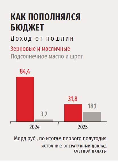 По данным Счетной палаты, по итогам первого полугодия объем поступлений в бюджет от экспортных пошлин на зерновые и масличные составил 31,8 млрд руб. против 84,4 млрд руб. за тот же период годом ранее. Пошлина на подсолнечное масло и шрот принесла около 18,1 млрд руб. против 3,2 млрд руб. в январе — июне 2024-го.