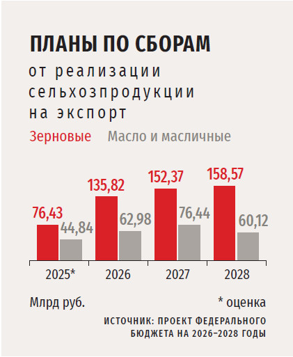 В следующие три года объемы сбора пошлин будут расти, считает Минфин. Согласно проекту федерального бюджета на 2026-й и плановый период 2027–2028 годов, его доходы от экспортных пошлин на зерно в следующем году предусмотрены на уровне 135,8 млрд руб., в 2027-м бюджет может пополниться за счет пошлин на 152,37 млрд руб., в 2028-м — примерно на 158,6 млрд руб. Экспортные пошлины на масличные культуры и масла должны принести бюджету почти 63 млрд руб. в 2026 году, 76,4 млрд руб. в 2027-м и 60,1 млрд руб. в 2028-м. Сокращение потенциальных поступлений связано с тем, что в расчетах учтены сроки окончания действия повышенных ставок пошлины на сою и рапс в августе 2026 года, а также на подсолнечник, масло и шрот — в августе 2028-го.