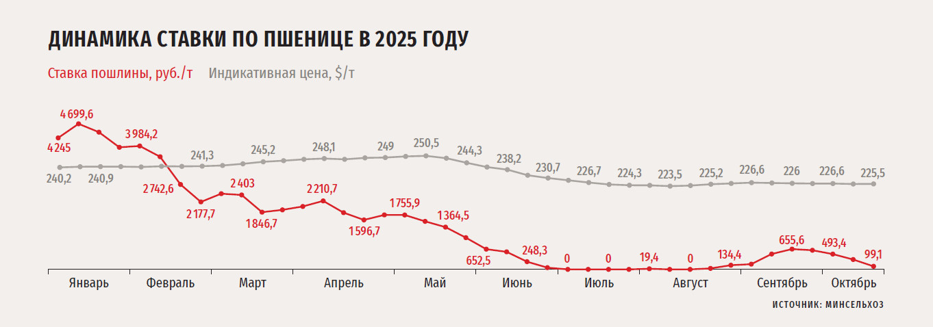 Так, по данным Минсельхоза, на неделе с 22 по 29 октября пошлина на экспорт пшеницы составила 99,1 руб./т, на кукурузу и ячмень — была нулевой (последние опубликованные данные на момент написания статьи). Для сравнения, с 15 по 22 января ставка по пшенице достигала 4245 руб./т, на кукурузу — 4436,4 руб./т, на ячмень — 2542,9 руб./т. С июня пошлина на пшеницу опустилась менее чем до 1 тыс. руб./т и больше не превышала эту отметку, весь июль и отчасти в августе была нулевой.