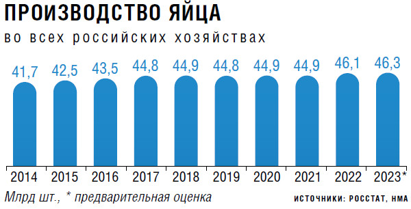 По итогам 12 месяцев завершившегося года объем выпуска столового яйца увеличился на 1,5 %, сообщает президент Agrifood Strategies Альберт Давлеев. И это несмотря на то, что в результате вспышек гриппа птиц на трех птицефабриках было уничтожено поголовье и приостановлено производство, акцентирует внимание он: другие предприятия смогли компенсировать выпавшие объемы и даже немного увеличить их в целом по сравнению с предыдущим показателем. На конец декабря производство данного белкового продукта в стране достигло 46,2–46,3 млрд шт., следует из данных Национальной мясной ассоциации (НМА).