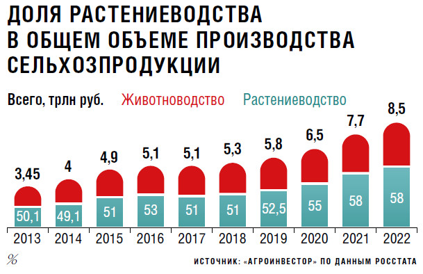 За последние пять лет вклад растениеводческой отрасли в общий объем выпуска сельскохозяйственных товаров в стоимостном выражении увеличился с 51 до 58 %. Рентабельность бизнеса аграриев тоже росла до прошлого года. В 2022-м показатель доходности растениеводов уменьшился сразу почти в полтора раза по сравнению с 2021-м. По итогам трех кварталов 2023-го снижение продолжилось. Без принятия мер по поддержке сектора и снятия ряда ограничений на экспорт массовое банкротство хозяйств будет неизбежно.