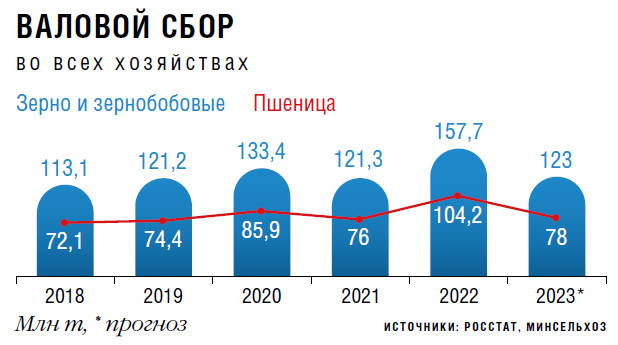 На одном из совещаний о ходе весенних полевых работ президент России Владимир Путин выразил надежду на то, что урожай в 2023 году будет «как минимум достойным», а в идеале — не хуже, чем в рекордном 2022-м. Пока же прогноз Минсельхоза на валовой сбор довольно сдержанный — 123 млн т всего зерна, в том числе 78 млн т пшеницы. В мае агроведомство оценивало сохранность озимых на уровне 93 %, что соответствует средним многолетним значениям.