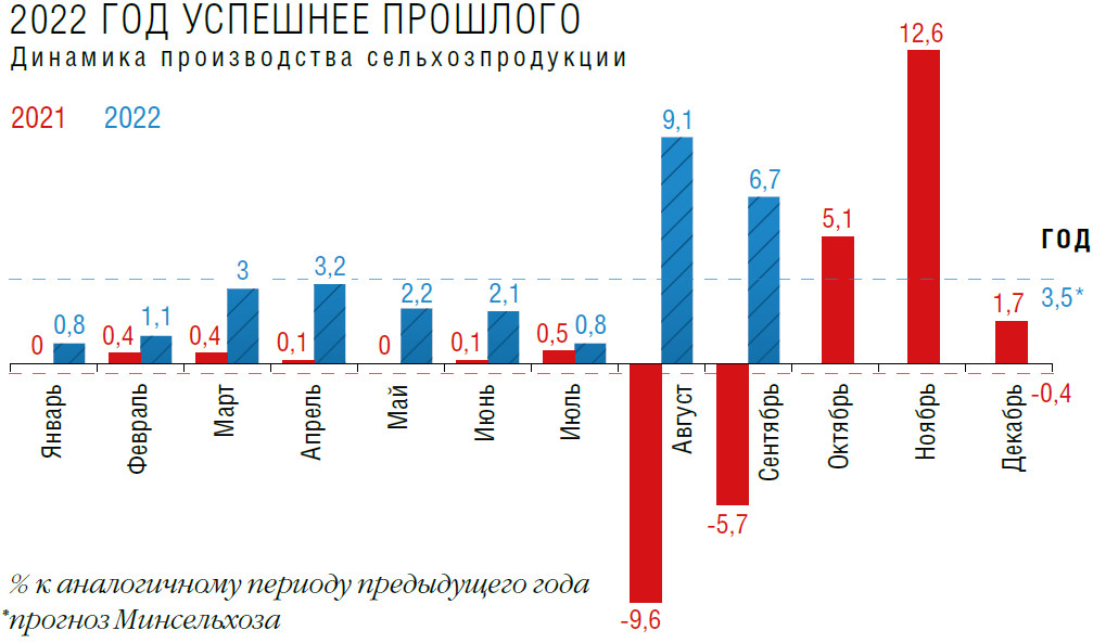 По прогнозу Минсельхоза, по итогам года агросектор может вырасти на 3,5 % после снижения на 0,4 % в 2021-м, об этом глава ведомства Дмитрий Патрушев сказал 21 ноября, докладывая о ситуации в отрасли. «В целом наш рынок продовольствия полноценно обеспечен собственной масложировой, мясной, рыбной продукцией, сахаром и макаронными изделиями, крупами и многими другими видами товаров. По всем этим позициям за девять месяцев текущего года мы наблюдаем увеличение объемов производства. И конечно же, рассчитываем на сохранение положительной тенденции», — отметил министр.