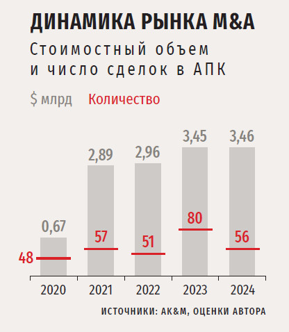 По предварительным итогам 2024 года объем рынка M&A в АПК и смежных секторах, несмотря на ожидание снижения, практически не изменился и составил $3,46 млрд против $3,45 млрд годом ранее. В рублевом выражении данный сегмент показал рост на 9,3 %, до 327 млрд руб. против 299 млрд руб. в 2023-м. В то же время количество сделок сократилось с 80 годом ранее до 56, а средняя стоимость сделки, наоборот, увеличилась с $43 млн до $62 млн. Ключевым сегментом рынка была пищевая промышленность — на нее пришлось около $1,93 млрд и 26 сделок, на сельское хозяйство — $1,23 млрд и 22 сделки, на транспорт — $0,31 млрд и 8 сделок.