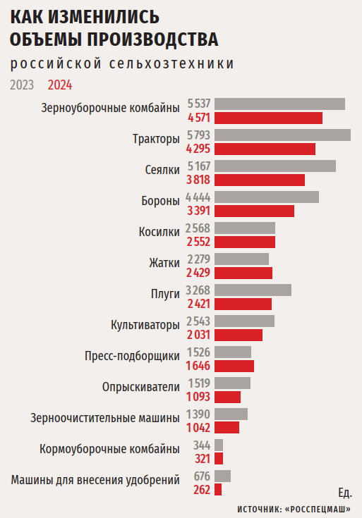По итогам 2024-го сократилось производство и у «Ростсельмаша». Сразу на 30 % по сравнению с ростом в 40 % в 2023 году. Совладелец компании Константин Бабкин тоже объяснял такую ситуацию уменьшением спроса на технику со стороны аграриев, а также тем, «что в этом году меры поддержки со стороны правительства гораздо хуже работали» (цитата по «Коммерсанту»). По его словам, программа субсидирования покупки сельхозтехники в прошлом году была профинансирована властями не в полном объеме и не вовремя. Снижение объема реализации продукции предприятия Бабкин тоже оценивал в 30 %.