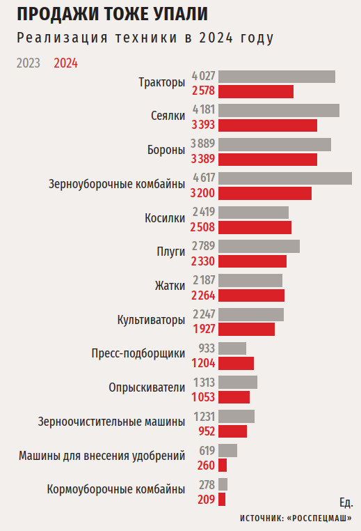 В 2024 году зафиксировано снижение продаж новой техники, таким образом, положение с устареванием техпарка к лучшему не изменилось. Помимо устаревания техпарка, существует и проблема его недоукомплектованности. Минсельхоз оценивает нехватку тракторов в 65 тыс. ед., комбайнов — в 34 тыс.