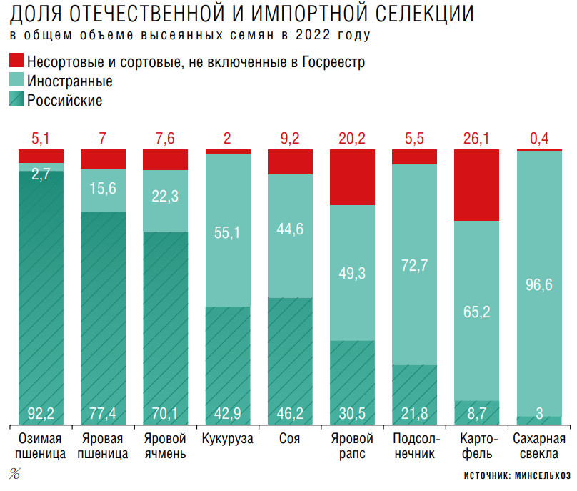 Высокая доля зарубежного семенного материала сохраняется в подсолнечнике, кукурузе, рапсе, сое, практически всех овощах — как тепличных, так и открытого грунта. Зависимость от импорта по семенам подсолнечника гендиректор «Щелково Агрохим» Салис Каракотов оценивает в 70–77 %. Член совета директоров «Малино» Татьяна Губина подтверждает: компания в производстве овощей открытого грунта и картофеля использует в основном семена иностранной селекции. Семян российских сортов для выращивания данной продукции на рынке пока нет в нужном объеме, констатирует она.
