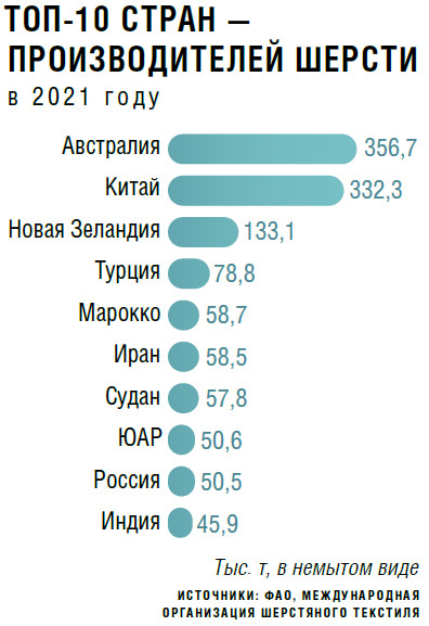 Еще недавно аналитики фиксировали снижение производства шерсти в мире. Так, по данным ФАО, с 1995 по 2019 год объем ее выпуска в немытом виде сократился с почти 2,6 млн т до 1,7 млн т. Негативный тренд наблюдался во всех ведущих шерстепроизводящих странах за исключением Китая и Марокко. С 2020-го ситуация начала меняться: совокупное глобальное производство перестало уменьшаться прежними темпами, а многие государства стали наращивать объемы.