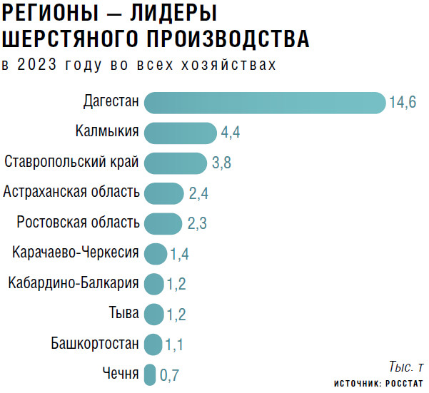 Российская шерстяная отрасль пока развивается вразрез с мировым трендом. Согласно информации Росстата, в 1990 году во всех хозяйствах страны было произведено 226,7 тыс. т шерсти (доля тонкорунных и полутонкорунных пород овец доходила в общем поголовье до 80 %), однако уже к 2010-му ее объем сократился более чем в четыре раза. С 2010 по 2020-й показатель колебался в пределах 52–56 тыс. т, а с 2021-го, вопреки глобальным тенденциям, продолжил снижаться, опустившись до 45,7 тыс. т по итогам 2023 года.