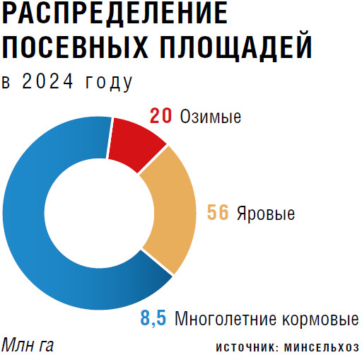 Общая посевная площадь сельхозкультур в России в 2024 году составит 84,5 млн га, что на 300 тыс. на больше, чем в 2023-м, оценивал Минсельхоз в конце января. В том числе 20 млн га находятся под озимыми культурами, 56 млн га займут яровые, а еще 8,5 млн т — многолетние кормовые.