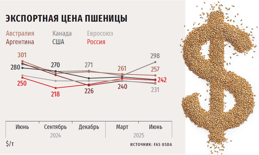 По информации аналитического центра «Русагротранса», за 11 месяцев сезона 2024/25 из нашей страны за рубеж было отправлено 49 млн т зерновых культур, что на 18,2 млн т меньше, чем в сезоне 2023/24, когда экспорт составил 67,1 млн т. При этом вывоз пшеницы сократился на 10 млн т — с учетом поставок в страны ЕАЭС на внешние рынки отправлено 40,9 млн т. В последние месяцы завершившего сезона отгрузки очень серьезно, но предсказуемо снижались, комментирует гендиректор Института конъюнктуры аграрного рынка (ИКАР) Дмитрий Рылько. В сравнении как с первой половиной сельхозгода, так и с аналогичным периодом сезона 2023/24. «По итогам июня экспорт будет совсем невелик, в частности, пшеницы удастся вывезти лишь около 1 млн т», — говорил эксперт в конце мая. За весь сезон общий объем поставок может составить 50,2 млн т, а главной зерновой позиции — около 40,8 млн т, прогнозировал он тогда же, добавляя, что это «неформальные оценки, поскольку официальные таможенные данные закрыты, плюс есть неопределенности по экспорту с новых территорий».