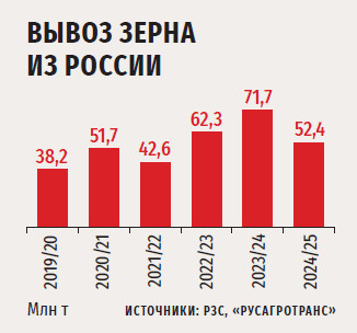 Прогноз «Русагротранса» — 49,8 млн т зерновых, а с учетом зернобобовых — 52,4 млн т. Это меньше, чем в 2023/24-м, когда вывоз зерновых и зернобобовых был рекордным — 72,8 млн т, обращает внимание руководитель аналитического центра компании Игорь Павенский. Экспорт пшеницы эксперт оценивает на уровне 41,5 млн т против 55,5 млн т в предыдущем сельхозгоду, ячменя — 4,6 млн т против 9 млн т сезоном ранее, кукурузы — 3,05 млн т против 7,34 млн т. «На протяжении августа — декабря темпы вывоза превышали прошлый сезон, но с января на фоне сокращения экспортной квоты с 29 млн т до 10,6 млн т, а также из-за отрицательной экспортной доходности темпы поставок замедлились и стали существенно ниже прошлогодних», — рассказывал Павенский в начале июня.