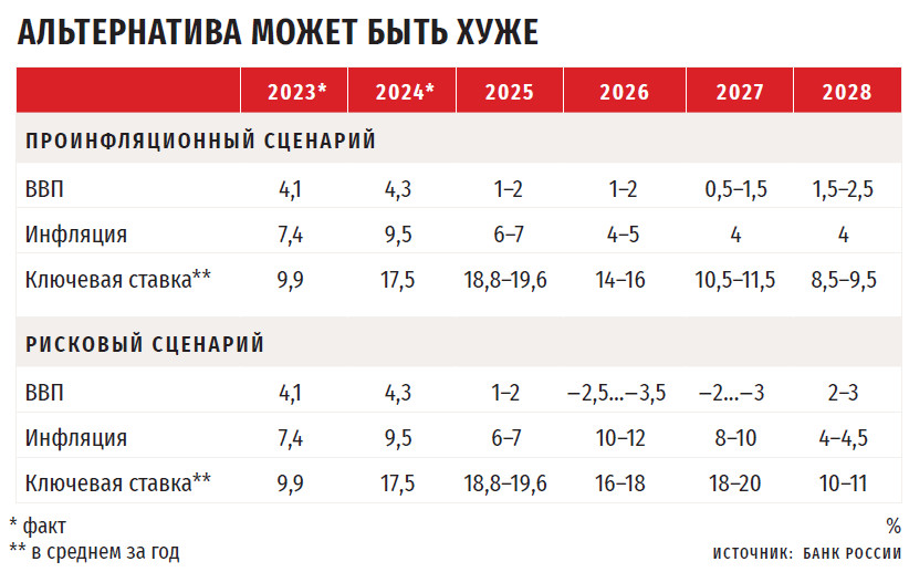 Рисковый сценарий, как и год назад, допускает мировой финансовый кризис, сопоставимый по масштабам с кризисом 2007– 2008 годов. Для российской экономики предполагается усиление санкционного давления. При таком развитии событий в 2026 году ВВП снизится на 2,5–3,5 %, в 2027-м — на 2–3 %, а в 2028-м экономика начнет расти восстановительными темпами на 2–3 %. Инфляция в этом сценарии в 2026 году составит 10–12 %, ключевая ставка сложится в диапазоне 16– 18 %, но в 2027-м может вырасти до 18– 20 %, что позволит замедлить инфляцию до 8–10 %. За 2028 год средняя ключевая ставка сложится в диапазоне 10– 11 %, инфляция опустится до 4–4,5 %.
