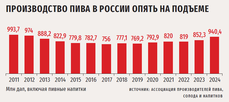 Объем российского производства пива, включая пивные напитки, в 2024 году составил 940,4 млн дал, следует из данных Росстата. Это на 10,3 % превышает показатель 2023-го, отметил исполнительный директор Ассоциации производителей пива, солода и напитков (АПП) Вячеслав Мамонтов на прошедшем летом в Чебоксарах фестивале «Зеленое золото России». В первом полугодии 2025-го, по его информации, было выпущено 455,1 млн дал, что на 3,7 % больше, чем за аналогичный период годом ранее.
