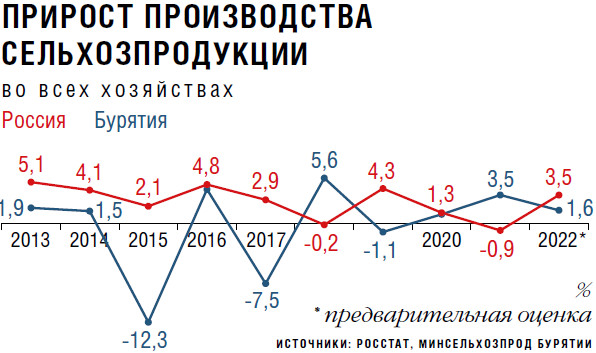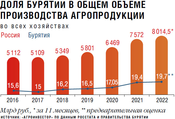 Доля АПК Бурятии в общероссийском объеме выпуска сельхозпродукции составляет менее 0,3 %, однако в последние шесть лет республика динамично расширяет производство. Согласно предварительной оценке правительства региона, по итогам 2022 года местный агропром вырастет примерно на 1,6 %, до 19,7 млрд руб. На животноводство в этом объеме приходится около 63 %.