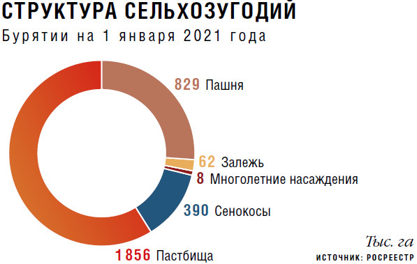 Протяженность территории республики с севера на юг — 825 км, с запада на восток — 1206 км. По данным Росреестра Бурятии, общая площадь сельскохозяйственных угодий в республике в 2022 году составляла 2,14 млн га, из них неиспользуемые — 588,6 тыс. га (пашня — 544 тыс. га, залежь — 44,6 тыс. га). Сенокосы и пастбища задействованы в полном объеме, так как регион имеет животноводческое направление. Пашня используется на 22,2 % (площадь в обработке во всех хозяйствах — 155,1 тыс. га). «Для возделывания агрокультур заняты наиболее плодородные участки, неиспользуемые сельхозземли не несут ценности для ведения растениеводческой деятельности, в связи с чем не введены в оборот», — поясняет представитель Министерства сельского хозяйства и продовольствия Бурятии. По его словам, к неиспользуемым площадям в первую очередь относятся земли, переданные в ведение сельских и поселковых администраций и расположенные за чертой населенных пунктов. Это поля, изъятые у бывших агропредприятий на начальном этапе их реформирования. Они по большей части не задействованы в производстве, или на них работают без оформления соответствующих документов. Сюда также относятся невостребованные земельные доли ликвидированных хозяйств.