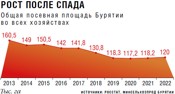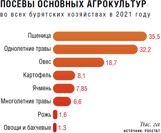 За последние 10 лет общие посевные площади в Бурятии сократились на четверть, однако в 2021-м и 2022-м они опять пошли в рост. По предварительной оценке Минсельхозпрода республики, всего агрокультурами было занято 120,8 тыс. га, в том числе зерновыми и зернобобовыми засеяли 69,8 тыс. га (на 4 тыс. га больше, чем годом ранее), кормовыми — 38,1 тыс. га (+100 га), картофелем — 8,7 тыс. га (+600 га), овощами — 1,4 тыс. га (+130 га).