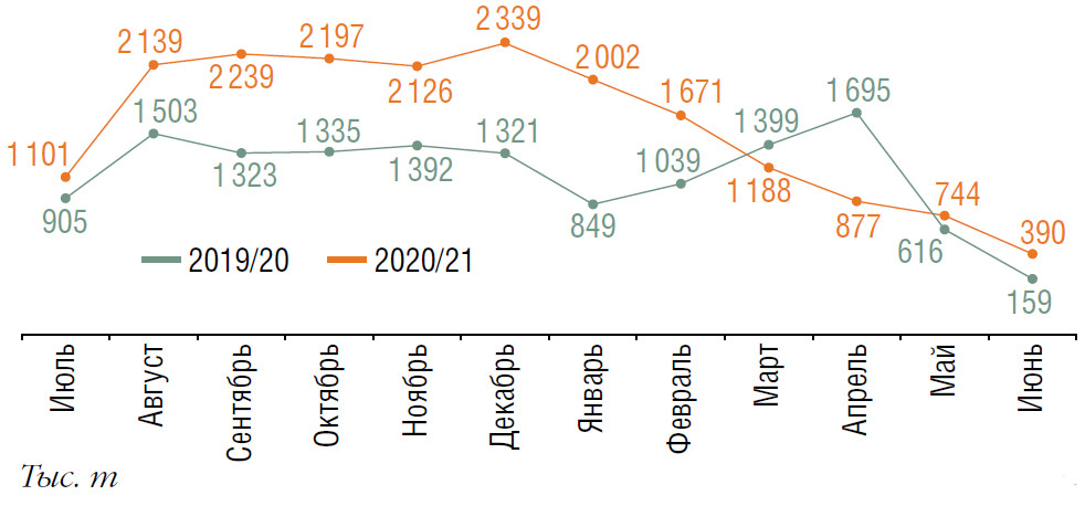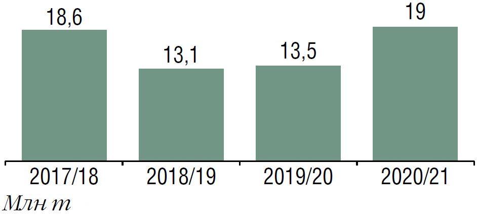 В то же время объемы поставок на экспорт с Юга и Северного Кавказа в прошлом сезоне из-за снижения урожая суммарно упали в 1,5 раза — до 3,5 млн т с 5,3 млн т годом ранее. Это минимум за последние пять лет, обращает внимание Павенский. Перевозки из Сибири, где урожай был ненамного выше 2019 года, незначительно превысили уровень прошлого года и достигли 1,5 млн т.