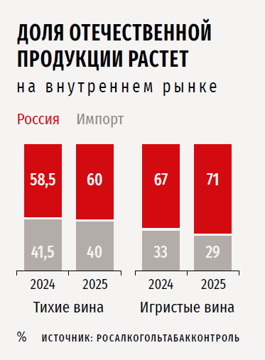 По оценке Росалкогольтабакконтроля, доля российской продукции в тихих винах в общем объеме рынка в 2025 году поднялась до 60 % (в 2024-м — 58,5 %), а игристых — до 71 % (67 %). «С одной стороны, это уже серьезный результат, с другой — показатель того, что потенциал роста все еще большой», — обращает внимание Антипина. Прогнозируется, что к 2029-му доля отечественных вин может вырасти примерно до 74 %, а общий объем рынка в денежном выражении достигнет порядка 731 млрд руб.