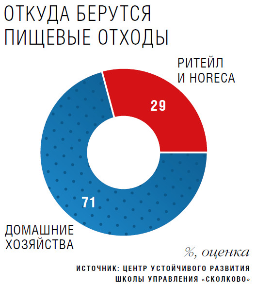 Оценочно общие потери продовольствия в стране достигают 40 % его совокупного оборота. Они возникают из-за различных факторов — человеческого, технологического, природно-климатического и рыночного — например, в связи с низкой квалификацией персонала, нарушением условий хранения, транспортировки и др. Если говорить про потери продуктов питания на этапе розничной торговли и потребления, то они составляют около 17,9 млн т в год, или 21 % совокупного объема производимого продовольствия, и оцениваются в 1,64 трлн руб., что эквивалентно 12 % оборота розничной торговли продуктами питания в России, сравнивает директор дивизиона «Экология» Агентства стратегических инициатив (АСИ) Максим Евдокимов. Становясь пищевыми отходами, на которые приходится наибольшая доля в составе твердых коммунальных отходов (ТКО) населения (до 30 %), 94 % этой продукции направляется на мусорные полигоны, 6 % перерабатываются в компост или технический грунт.