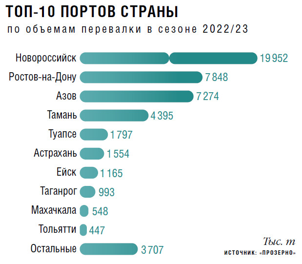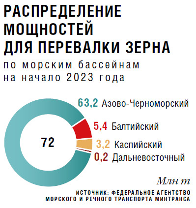 Согласно оценке Федерального агентства морского и речного транспорта Минтранса России, мощности специализированных морских терминалов для отгрузки зерна из России на начало 2023-го составляли 72 млн т, отмечает гендиректор аналитической компании «ПроЗерно» Владимир Петриченко (см. график на стр. 22). В этом объеме 88 % занимают порты Азово-Черноморского бассейна (АЧБ).