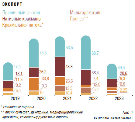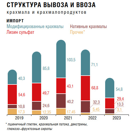 В 2022-м поставки из-за рубежа уменьшились, так как рынок «успокоился», не было необходимости приобретать товар в таких количествах, как годом ранее. А в прошлом году совокупный ввоз опустился практически до уровня пятилетней давности — в первую очередь благодаря насыщению внутреннего рынка отечественными продуктами (сиропами) и запрету на экспорт модификаций крахмалов из стран Евросоюза, из-за чего началось замещение модификаций нативными крахмалами везде, где это позволяла рецептура конечных продуктов. В результате снизился ввоз всей линейки нативных крахмалов (пшеничный, кукурузный, картофельный и др.), что и стало одним из основных драйверов уменьшения импорта.