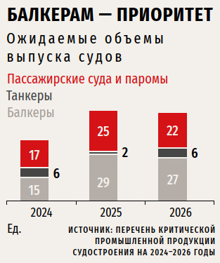 Также он добавил, что на возведение одного крупнотоннажного судна типа Supramax (дедвейт — 60 тыс. т) потребуется минимум пять лет. «В этом вопросе мы ориентируемся на опыт китайских коллег, который показывает, что реализовать проект возможно за несколько лет, — отметил спикер. — Увы, текущие мощности и технологии не позволяют ускорить процесс производства на отечественных верфях, почти все стапеля заняты строящимися судами гражданского и военного назначения». В то же время в апреле 2023-го ныне первый зампредседателя правительства, а тогда министр промышленности и торговли Денис Мантуров говорил, что до 2027 года в России в рамках проекта льготного лизинга будет построено около 150 грузовых судов, в том числе танкеров, зерновозов, контейнеровозов, буксиров, сухогрузов и барж. А чуть позже в мае Патрушев заявлял, что первый по новому российскому проекту балкер для перевозки зерна планируется сдать уже в конце 2025-го — начале 2026 года.