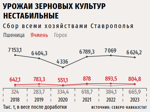 Регион в силу географического расположения тяготеет прежде всего к экспортно ориентированным зерновым культурам — пшенице, ячменю, кукурузе, информируют в ставропольском филиале «Центра Агроаналитики». Из-за погодных условий и частых засух летом производители отдают предпочтение озимым, которые традиционно дают более высокий и стабильный урожай за счет накопления влаги за зимний и весенний периоды. Так, по итогам 2023 года, по данным местного филиала «Центра Агроаналитики», урожай озимой пшеницы составил 6,6 млн т, или около 72 % всего сбора зерна. Второе место в группе зерновых занимает кукуруза (около 9,5 %), а третье — озимый ячмень (8,8 %). Кстати, по площади посевов последнего Ставрополье занимает первое место в стране, хотя по валовому сбору из-за более низкой урожайности проигрывает Краснодарскому краю.