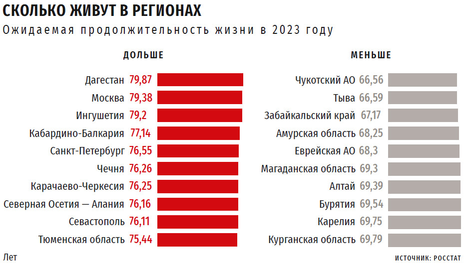 В России также есть регионы, где люди живут дольше, чем обычно. Давайте назовем наши регионы с долгожителями «лазоревыми» во избежание ненужных коннотаций. К таким регионам относятся Дагестан (ожидаемая продолжительность жизни — около 80 лет), Москва и Ингушетия (79 лет), Кабардино-Балкария и Санкт-Петербург (77 лет).
