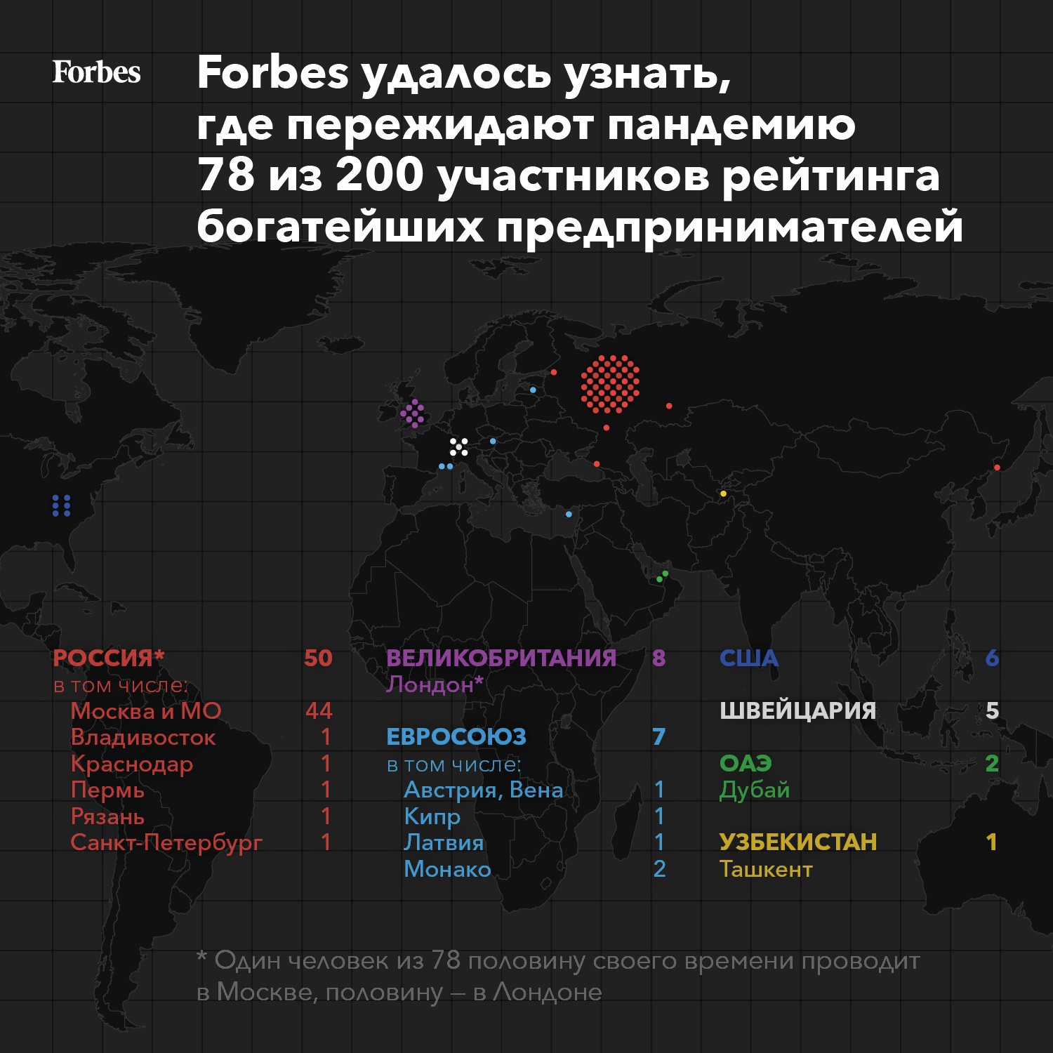 Чем занимаются миллиардеры во время пандемии коронавируса? Forbes решил спросить об этом участников своего рейтинга. Достучаться удалось далеко не до всех 200 человек. Мы смогли выяснить, где сегодня находятся 78 участников списка. Многие из них согласились что-то о себе рассказать только на условиях анонимности, но составить общую картину нам все-таки удалось.