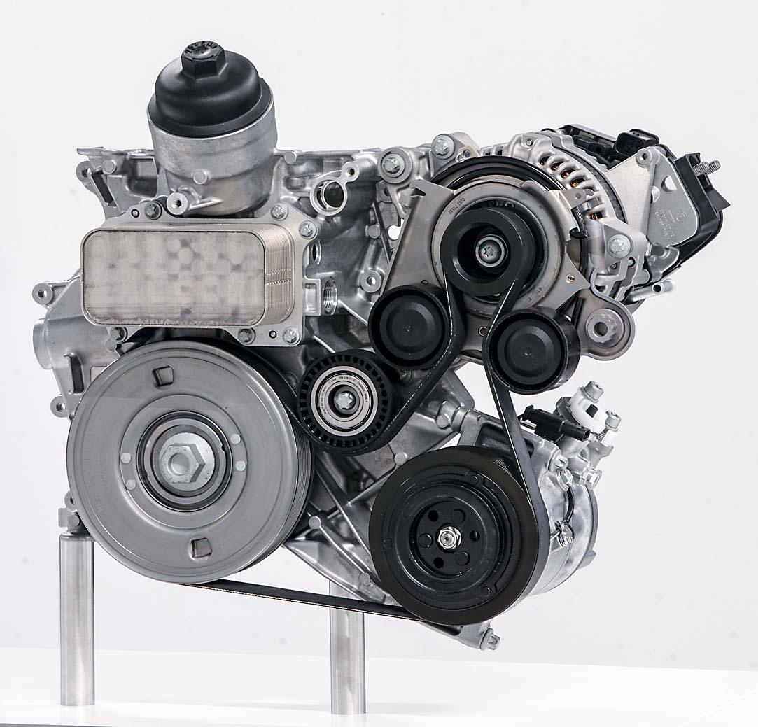 На новой рядной «шестерке» M 256 – еще одной рабочей единице, предназначенной для S-Класса и крупных кроссоверов – нейтрализатор чуть ли не «прилеплен» к блоку. Но главная фишка этого двигателя – прикрепленный к мыску коленчатого вала стартер-генератор, питающийся от вспомогательной сети с напряжением 48В. Устройство не только запускает мотор после остановки, но и помогает раскручивать коленвал в широком диапазоне оборотов, а во время торможений еще и подзаряжать батарею.