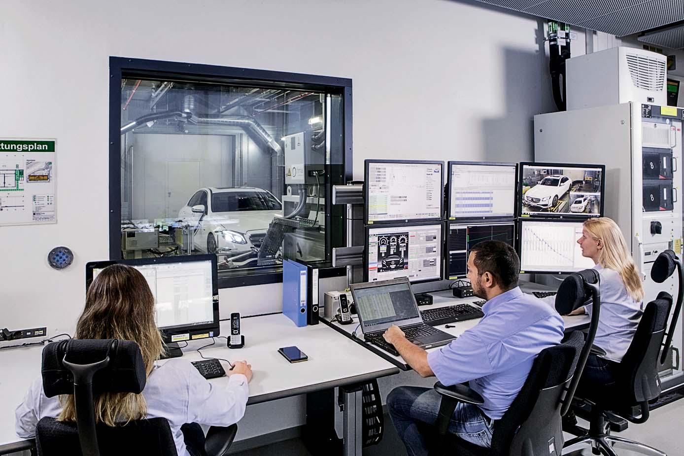 Как известно, мало создать мотор – нужно еще грамотно его настроить для работы на конкретном автомобиле. Большая часть таких работ по-прежнему происходит на основе реальных ездовых тестов, однако немалую часть операций по калибровке систем управления двигателями и трансмиссиями инженеры будут выполнять на стендах только что открывшегося в Зиндельфингене лабораторно-испытательного комплекса. Здесь десять отдельных боксов, позволяющих делать измерения в условиях, очень приближенных к реальным. Испытатели могут менять температуру от +42 до –30 °C, моделировать скорость встречного потока воздуха вплоть до максимальных 180 км/ч, имитировать движение на высоте 5000 м над уровнем моря. Все это происходит дистанционно, с помощью программ. Машина автономно заправляется, электродвигатели динамических нагрузочных стендов вращаются, измерительная аппаратура фиксирует показания датчиков. Лаборатории нового комплекса могут работать безостановочно, 24 часа в сутки.