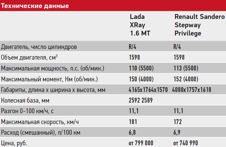 В документах работающего на 95-м бензине Sandero Stepway указана мощность 113 л.с., для Lada допускается топливо Аи-92 (хотя предпочтителен опять же 95-й), сказывается более низкая подоконная линия и более тонкие передние стойки. Проектируя салон XRay, специалисты ВАЗа постарались избавить его от недочетов интерьера Sandero: чтобы водителю было удобнее смотреть на экран медиасистемы, его переставили повыше, потеснив дефлекторы обдува. Рулевое колесо в Lada более изящно, а рычажок «поворотников» снабжен режимом трехкратного мигания – на Renault этой функции нет. Располагает Lada в схожей комплектации датчиками света и дождя. Есть и обогрев лобового стекла – у Renault за эту опцию нужно доплачивать.