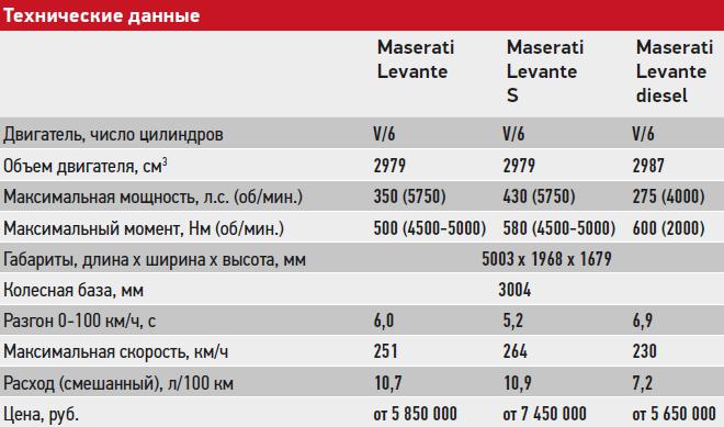 Базовая архитектура – та же, что у Quattroporte и Ghibli, но в любой комплектации предусмотрены пневмоэлементы, позволяющие в широком диапазоне менять клиренс автомобиля: с базовой высоты в 210 мм можно опуститься на две ступеньки (минимальные 175 мм доступны на скорости выше 170 км/ч) и подняться также на две. Так что для преодоления внедорожного участка можно приподнять кузов на 40 мм. Предусмотрено четыре режима движения: помимо привычных Normal, Sport и Winter есть Off-road, в котором меняется отклик двигателя, трансмиссии и электронных амортизаторов Skyhook. Двигатели те же, что на седанах, однако бензиновые V6 прибавили по 20 л.с. мощности и по 30 Нм крутящего момента. Характеристики же турбодизеля V6 остались без изменений (лишь для Италии мощность ужали с 275 до 250 л.с.). Кинематическая цепь предусматривает восьмидиапазонный автомат c укороченной по сравнению с Ghibli главной парой и постоянный полный привод, в котором тяга распределяется через многодисковую муфту и систему Torque Vectoring. Что касается кузова, то из алюминия выполнены безрамочные двери, капот и крышка багажника, передняя поперечина, а из магния – крепление передней панели.