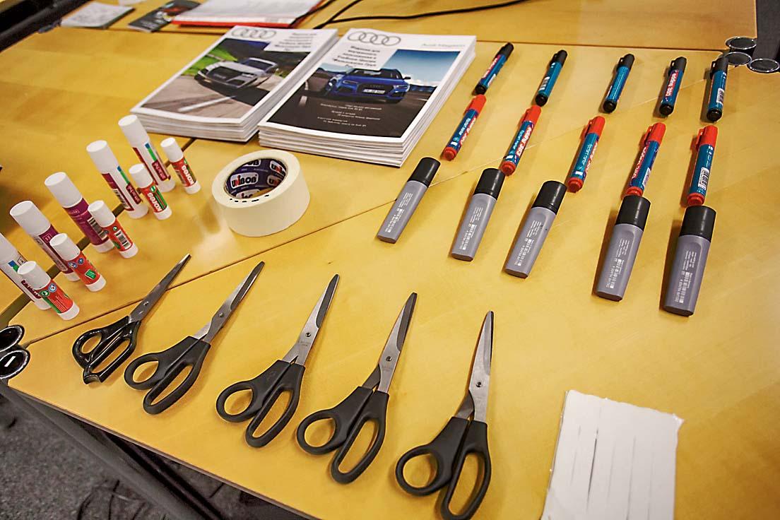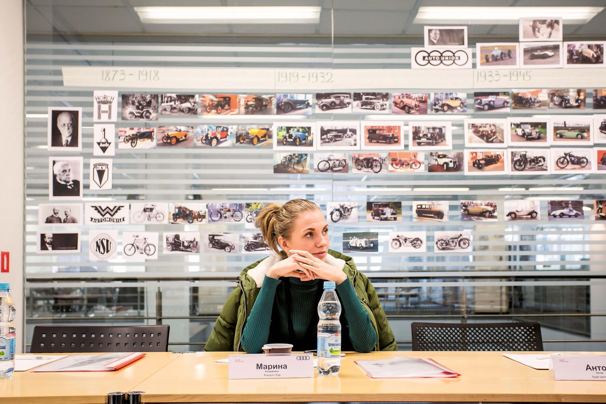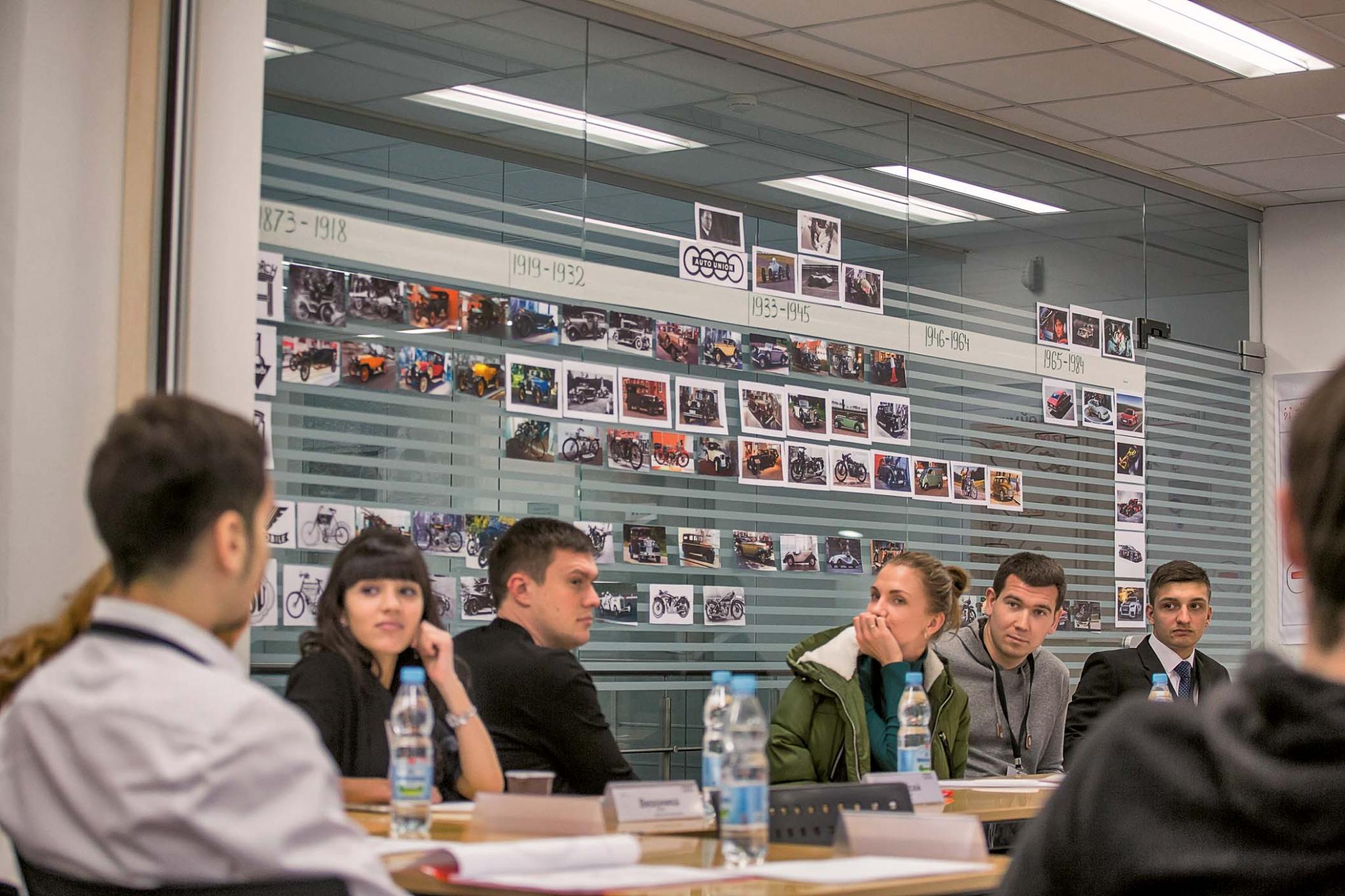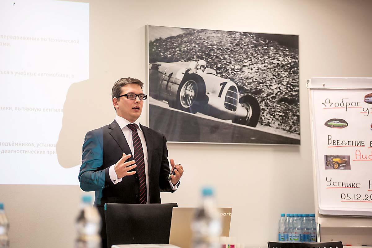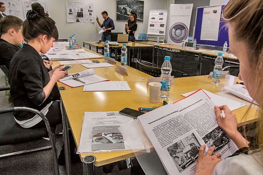 Причем занятие проходит в интерактивной форме. После знакомства участников друг с другом и инструктажа по технике безопасности Никита проводит небольшой блиц-рассказ об основных периодах истории XX века и о месте автомобиля в ней. При этом столетие раздроблено на временные отрезки так, что каждое из них так или иначе связано с важной вехой в истории самой марки Audi. Затем Никита делит группу на небольшие команды из двух-трех человек, каждой из которых поручает подготовить презентацию о периоде жизни Audi с иллюстрированными плакатами. При этом всю необходимую литературу и журналы с иллюстрациями, из которых можно вырезать любые картинки, он выдает предварительно. Группы готовят презентации и начинают выступать друг перед другом с докладами. К концу занятия история Audi собирается в единый целостный рассказ, который по сути выстраивают сами обучающиеся. Кроме того, в ходе занятия сотрудники дилеров детально изучают не только исторические модели Audi, но и весь актуальный модельный ряд.