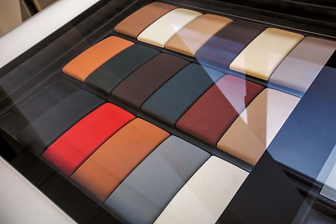 Мы спускаемся на первый этаж, в боксы. В каждом из которых кроме наглядных пособий стоят и учебные автомобили. На алом седане A3 небольшая группа диагностов отрабатывает проверку и обслуживание электронного оборудования седана. Поэтому не мешаем им и проходим в еще одно, третье помещение, где кроме «технарей» проходят обучение и продавцы, и специалисты по аксессуарам. Это зал, в котором обучают работать с комплектациями Audi Exclusive. Здесь представлена не только актуальная линейка кожи, алькантары и дерева, которыми отделывают современные автомобили Audi, но и материалы, которые прежде использовались в отделке.