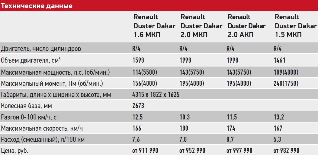 Зато клиенты Renault, присматривающиеся к Duster Dakar, могут выбирать двигатель и коробку передач. Доступны два бензиновых мотора – объемом 1,6 и 2,0 л и мощностью 114 и 143 л.с. соответственно, а также дизель 1.5 с отдачей 109 л.с. Все моторы агрегатируются с 6-ступенчатой механической коробкой с «короткой» первой передачей, но 2,0-литровый бензиновый двигатель может сочетаться еще и с 4-ступенчатым автоматом. Привод у всех спецверсий по умолчанию полный.