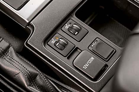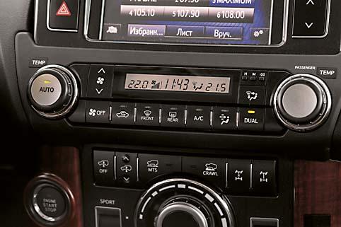 Land Cruiser Prado не столь современен внутри. По крайней мере с точки зрения дизайнерских решений. Всетаки сказывается солидный возраст модели. Но по отделке он мало чем уступает Pajero, а по эргономике в чем-то даже превосходит. Нам не понравилось лишь расположение блока управления полноприводной трансмиссией. Клавиши тут скомпонованы на центральной консоли вертикально. И для включения нужной функции приходится внимательно вглядываться в них. Все-таки смотреть на пиктограммки клавиш сверху, как в Pajero Sport – удобнее.