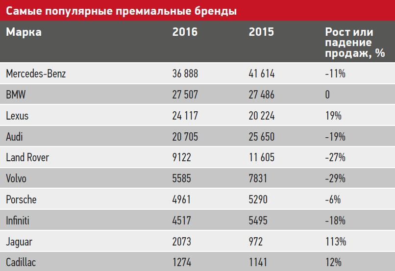 Марки высшего эшелона, работающие на узкий и обеспеченный круг клиентов, закончили год по-разному. Leхus и Сadillac – хорошисты. А вот Audi, Land Rover, Volvo и Infiniti сработали хуже рынка. Почему? Продажи нового XC90 никак не наберут должных оборотов, долгожданный Discovery пятого поколения появится у дилеров только весной, в Audi и Infiniti пока только грозят новинками. Лучше, но в целом неважно выступили компании Mercedes-Benz и Porsche. Зато здорово отличился Jaguar. Приехавший в конце лета в Россию кроссовер F-Pace сделал британцам кассу. Кстати, похожая ситуация и с отсутствующим в списке Bentley. Из 318 проданных за прошлых год автомобилей этой престижной марки 170 приходятся на новый кроссовер Bentayga.