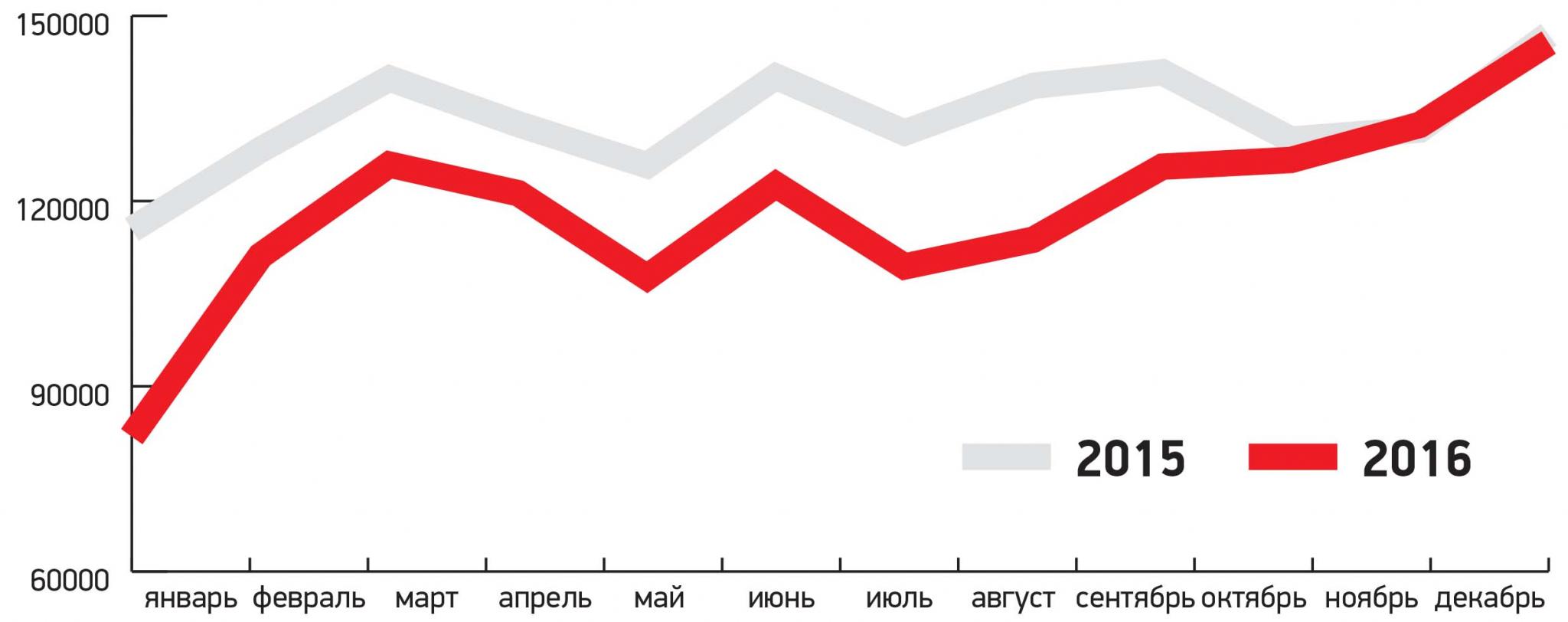 Большую часть прошлого года рынок падал. В какие-то месяцы машин покупали больше, в какие-то меньше. Вместе с тем с июля красная кривая графика пошла вверх, а ее ноябрьская точка оказалась даже чуть выше, чем на серой. Пусть всего на 0,6%, но ноябрьские продажи 2016 года оказались лучше, чем годом ранее. Результаты прошлого декабря оказались на 0,9% хуже, но графики почти слились в единую линию. Это один из признаков прекращения падения продаж, что, увы, еще не гарантирует роста.